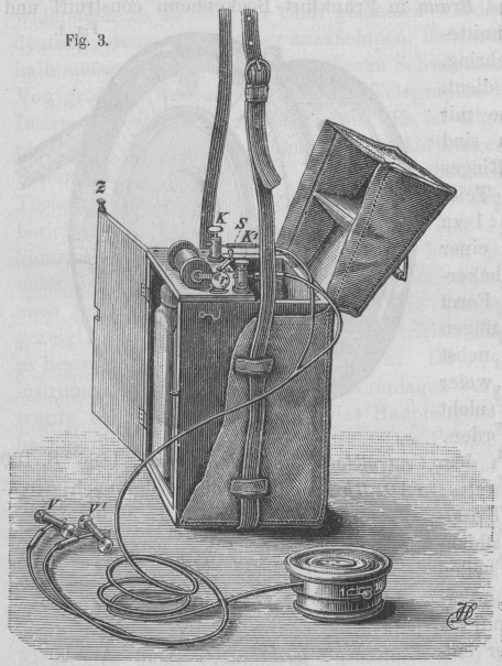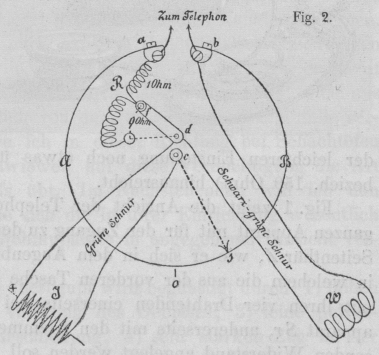 Fig. 2 zeigt nach dem Centralblatte für Elektrotechnik, 1886 * S. 160 das Schema des Apparates: aAOsBb ist der Meßdraht der nach Kirchhoff abgeänderten Wheatstone'schen Drahtcombination, R der aus zwei Theilen bestehende bifilare Vergleichswiderstand von 9 bezieh. 1 Ohm, welcher entweder je nach der Stellung des Umschalters df vollständig, oder nur mit dem kleineren Theile zu 1 Ohm eingeschaltet wird. An b und d wird der zu messende Widerstand W angelegt; es bedeutet den Schleifcontact, c und d stehen mit der secundären Spule eines kleinen Stöhrer'schen Inductionsapparates in Verbindung, welcher unmittelbar auf einem Trockenelemente angebracht ist. Die letzten beiden Apparate sind in einem zum Umhängen mit Schulterriemen versehenen Ledergehäuse geborgen; ein besonderes Gefach desselben dient zur Aufbewahrung des Telephons mit Drahtbrücke. Von den vier vom Telephon ausgehenden, zu einem kurzen Kabel vereinigten Drähten sind die zwei für den Inductor I bestimmten mit grüner Umklöppelung versehen, während die beiden anderen für den zu messenden Widerstand W schwarzgrün umklöppelt und an den Enden mit Klemmschrauben versehen sind. Die Skala ist an der der Telephonöffnung gegenüber stehenden, um etwa 330° drehbaren Deckscheibe angebracht (vgl. Fig. 1); an dieser ist auch der Schleifcontact befestigt, welcher jedoch nebst dem kalibrirten Meßdraht zum besseren Schütze im Inneren gelegen ist. Der Zeiger für die Skala befindet sich am Gehäuse, die Ablesung geschieht unmittelbar in Ohm. Die Messungen umfassen bei den Apparaten für den gebräuchlichsten; Zweck (Blitzableiter): die Widerstände von 0,1 bis 100 Ohm, während die Bewegung des Schleifcontactes zum Zwecke der leichteren Einstellung noch etwas über diese Grenzen (bis 0,06 bezieh. 150 Ohm) hinausreicht.