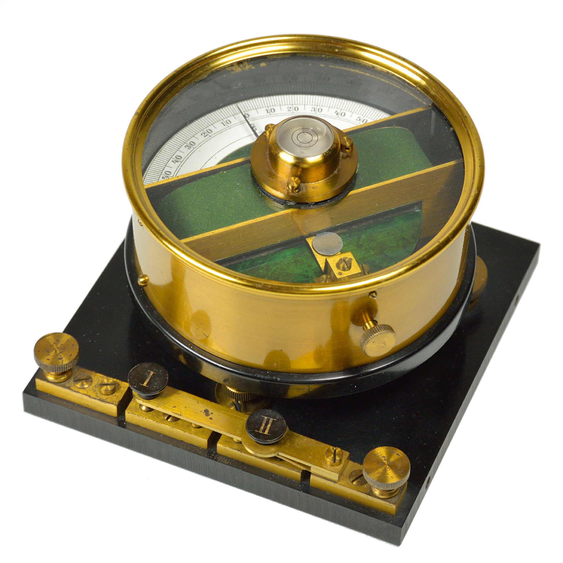 Das Gerät besteht im Wesentlichen aus drei Baugruppen. Das Gehäuse, aus verzapftem Mahagoni, lässt sich im oberen Teil öffnen (Deckel klappt nach hinten, Frontwand klappt nach vorne. Das Gehäuse ist mit einem einfachen Bartschlüssel gesichert, der Tragegriff aus Messing und Mahagoni ist auf dem klappbaren Deckel befestigt. Im Inneren finden die Trockenbatterien platz (diese sind jedoch nicht mehr vorhanden). Eine Basisplatte aus Ebonit bildet den Abschluss des Batteriefachs und gleichzeitig den Sockel für das Messwerk. Auf der Platte sind die Anschlussklemmen, die beiden Taster I und II sowie ein Widerstand und zwei Nivellierfüße. Das Messwerk sitzt in der nicht zentrischen Bohrung. Auf der Unterseite wird das Gerät durch eine Hülse und einer Feder gehalten, dies gewährleistet die drehbare Befestigung des Messwerks (um 360°). Die beiden Nivellierfüße (hinten, neben dem Widerstand) bilden gleichzeitig einen Anschlusspol für das Messwerk (äußerer Schleifring), der Zapfen vorne bildet den 2. Anschlusspol (innerer Schleifring). Das Nadelgalvanometer sitzt in einem runden Messing-Gehäuse (Ø ca. 110 mm), dessen Unterseite (Ebonit) mit zwei Schleifringen ausgestattet ist. Oben mittig sitzt eine Libelle zur Unterstützung der waagerechten Ausrichtung des Geräts. Die Nadel selbst besitzt eine Fixiereinrichtung. Die Skala besitzt eine lineare Einteilung von 70 ... 0 ... 70. Die Umrechnungstabelle zu den Widerstandswerten war ursprünglich auf der Innenseite des Deckels angebracht, diese fehlt hier. |