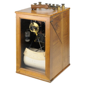 Das Messwerk ist in einem Holzgehäuse eingebaut, deren vorderer Teil inklusive Sichtglas abgenommen werden kann. Das Messwerk selbst besteht aus einem kräftigen Elektrodynamischen Meßwerk. Die Dämpfung erfolgt durch ein am Messwerk befestigten Plättchen, das in einem kleinen Becher bewegt wird (Die ursprüngliche Füllung des Bechers ist unbekannt, möglich wären Wasser, Öl oder Quecksilber). Der Zeiger, aus Aluminium gefertigt, wird oben in die Messing-Hülse, die direkt am Messwerk sitzt, eingesteckt. Die kleine Messing-Hülse am Zeiger dient zur Ausrichtung des Nullpunkts. Die Farbe wird in einem kleinen Schreibkopf, der drehbar am unteren Ende des Zeigers befestigt ist, eingefüllt. Die Tinte wird über eine dünne Rille außen auf das Papier übertragen. Der Schreiber besitzt einen Uhrwerk-Antrieb, der die große Schreiber-Trommel dreht. Der Mechanismus wird über den Hebel rechts aufgezogen. Die Geschwindigkeit kann zwischen 5 M (Minuten) und 3,4 H (Stunden) eingestellt werden. |