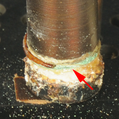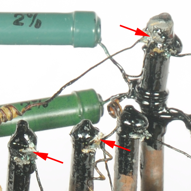 2/E Originalzustand, die eingebauten Manganin-Widerstände sind teilweise durch Kontaktkorrosion (siehe Detailaufnahmen) an den Lötstellen beschädigt und nicht mehr funktionsfähig. |