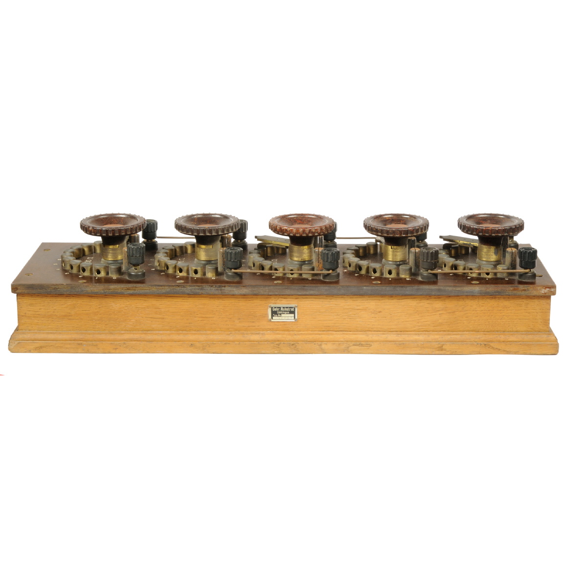 Der Rheostat besteht aus 5 Dekaden-Kurbeln (siehe unten), die auf einer Pressstoff-Platte montiert sind. Im Inneren des Gehäuses befinden sich die Widerstände. |