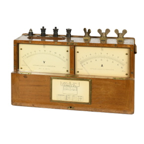 Das Mehrfachmessgerät ist als tragbares Gerät ausgeführt. Die beiden Messwerke sitzen in einem Holzgehäuse mit Lederriemen. Die Strom- und Spannungsanschlüsse sind oben am Gerät als Schraubklemmen ausgeführt. Der linke Teil des Messgeräts (Spannungsmessung) besitzt auf Ober- Unter- und Rückseite gelochte Bleche zur Belüftung. Die Skalen sind über eine Holzklappe verschlossen werden, auf der Innenseite dieser Klappe befindet sich auch die Anschaltanweisung. Die Nullpunktkorrektur der Messwerke befindet sich auf der Vorderseite des Gerätes. |