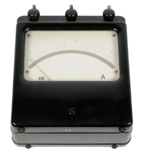 Das Gerät besitzt ein Kunststoff-Gehäuse aus schwarzem Pressstoff und ist für den waagerechten Betrieb ausgelegt. Die Skala ist als Spiegelskala ausgeführt mit einer nicht-linearen Unterteilung von 0 ... 20 bzw. 0 ... 6. Über drei Schraubklemmen (mit zusätzlicher Lasche und 4 mm Buchse), wird das Meßobjekt angeschlossen (Klemme 0 & 6 - 6 A; 0 & 20 - 20 A Messbereich). |