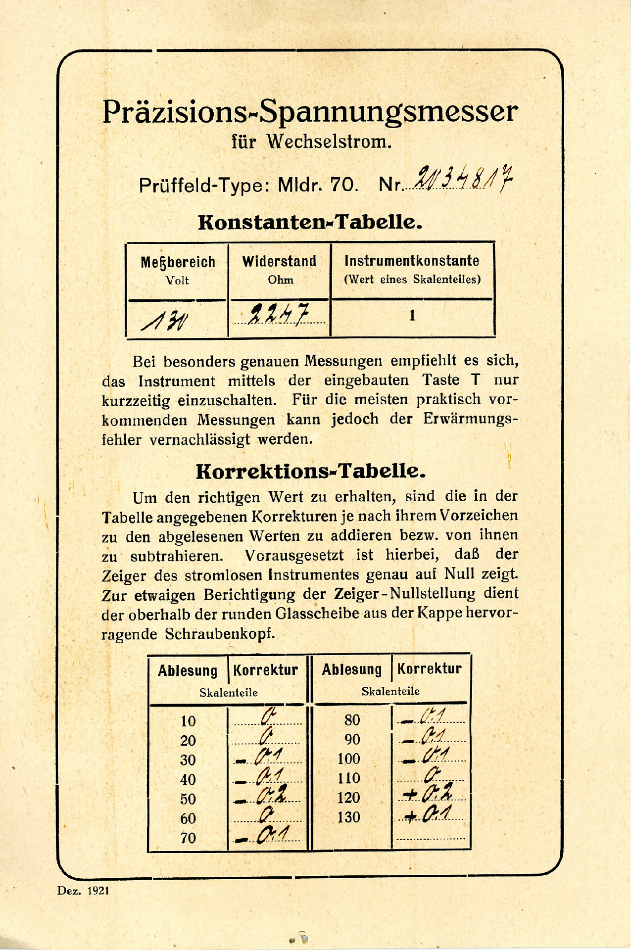 Dem Gerät liegt auch eine Prüfkarte von 12.1921 bei, auf dieser ist auch die Korrektions-Tabelle enthalten.