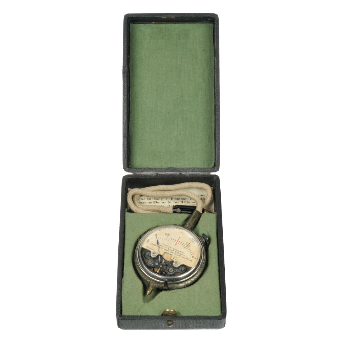 | Beschreibung | Der Elementprüfer ist ein Spannungszeiger mit kleinem Stromverbrauch, also großem inneren Widerstand. Durch Drücken auf die Taste wird parallel zum Instrument ein bekannter kleiner Widerstand geschaltet. Man kann daher die Elemente sowohl in nahezu offenem Zustand wie auch bei Strombelastung prüfen und misst also die elektromotorische Kraft und die Klemmenspannung des Elementes. Aus dem Unterschied der beiden gemessenen Werte kann man auf die Güte des geprüften Elementes schließen, da diese Differenz dem inneren Widerstand des Elementes proportional ist. |