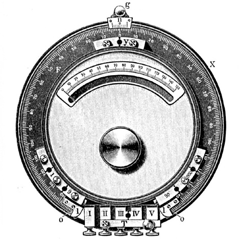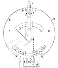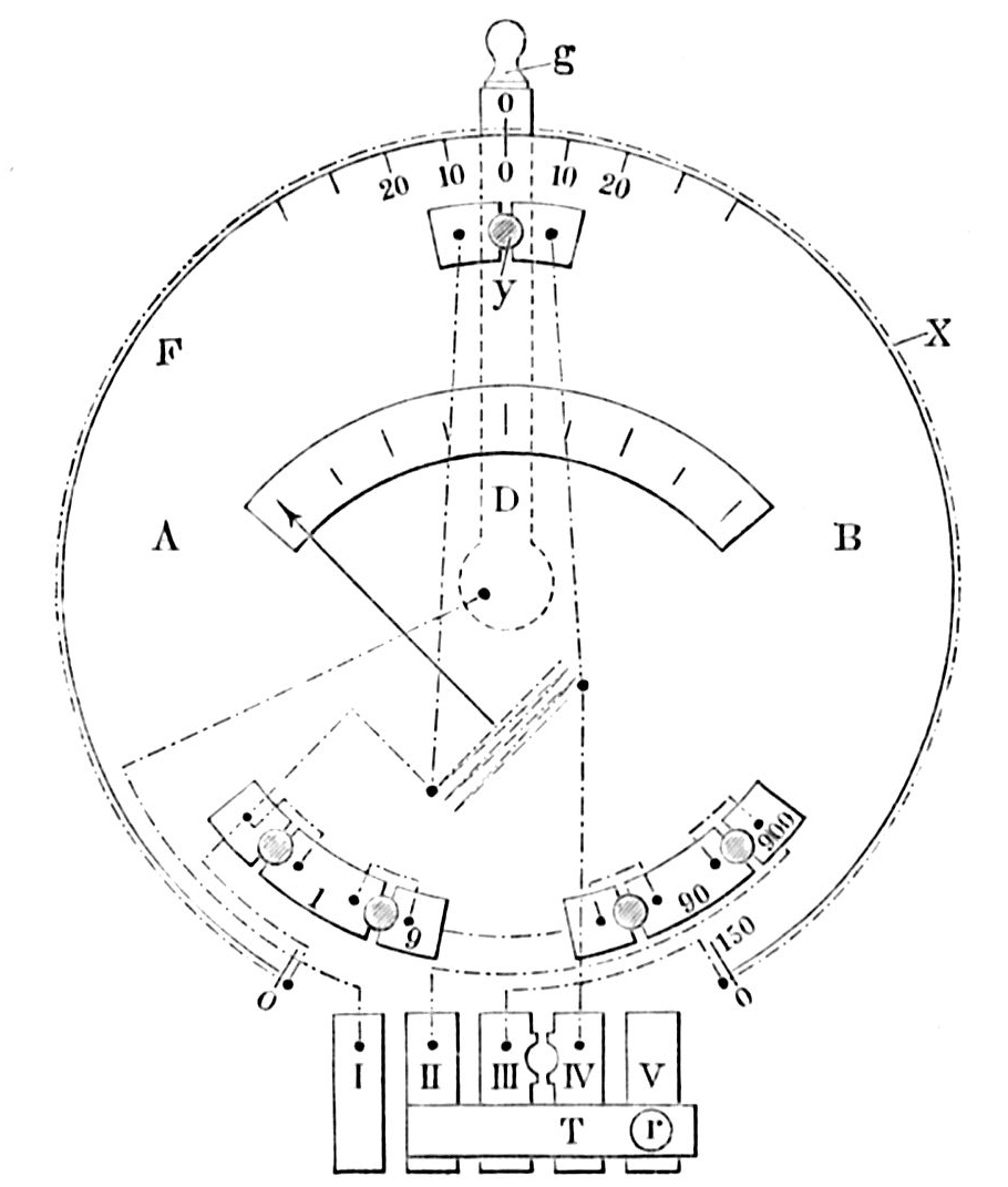 | Beschreibung | Das Universalgalvanometer von Siemens u. Halske, gestattet, nach Bedürfnis Widerstände, Spannungen und Stromstärken zu bestimmen. Es ist nach dem Prinzip der Wheatstoneschen Brücke gebaut, besitzt aber einen Strommesser in Gestalt eines Kupferrahmens im magnetischen Feld mit Zeiger, der über der innern Skala spielt. Der Strommesser ist auf einer Schieferplatte aufgestellt, um deren Rand in einer halbzylindrischen Rinne der Meßdraht X gelegt ist. Den Schieber der Kohlrauschschen Meßbrücke ersetzt ein Platinröllchen, das nebst dem Nonius n der drehbare Arm D trägt, und das durch eine Feder gegen den Draht gedrückt wird. Die Schieferplatte trägt oberhalb des Drahtes eine Teilung, die auf den beiden Hälften der Platte A und B sich von 0 bis 150° erstreckt. Auf ihren Endpunkten befinden sich die Klemmen. Die Widerstände, die durch Stöpselung ausgeschaltet werden können, liegen unterhalb der Schieferplatte und lassen mit dem Widerstand des Strommessers von 1 Ω, 10, 100 und 1000 Ω einschalten. Zwischen ihnen trägt das Instrument an Messingklötzen I bis V die Klemmschrauben zum Anschalten der Drähte. |