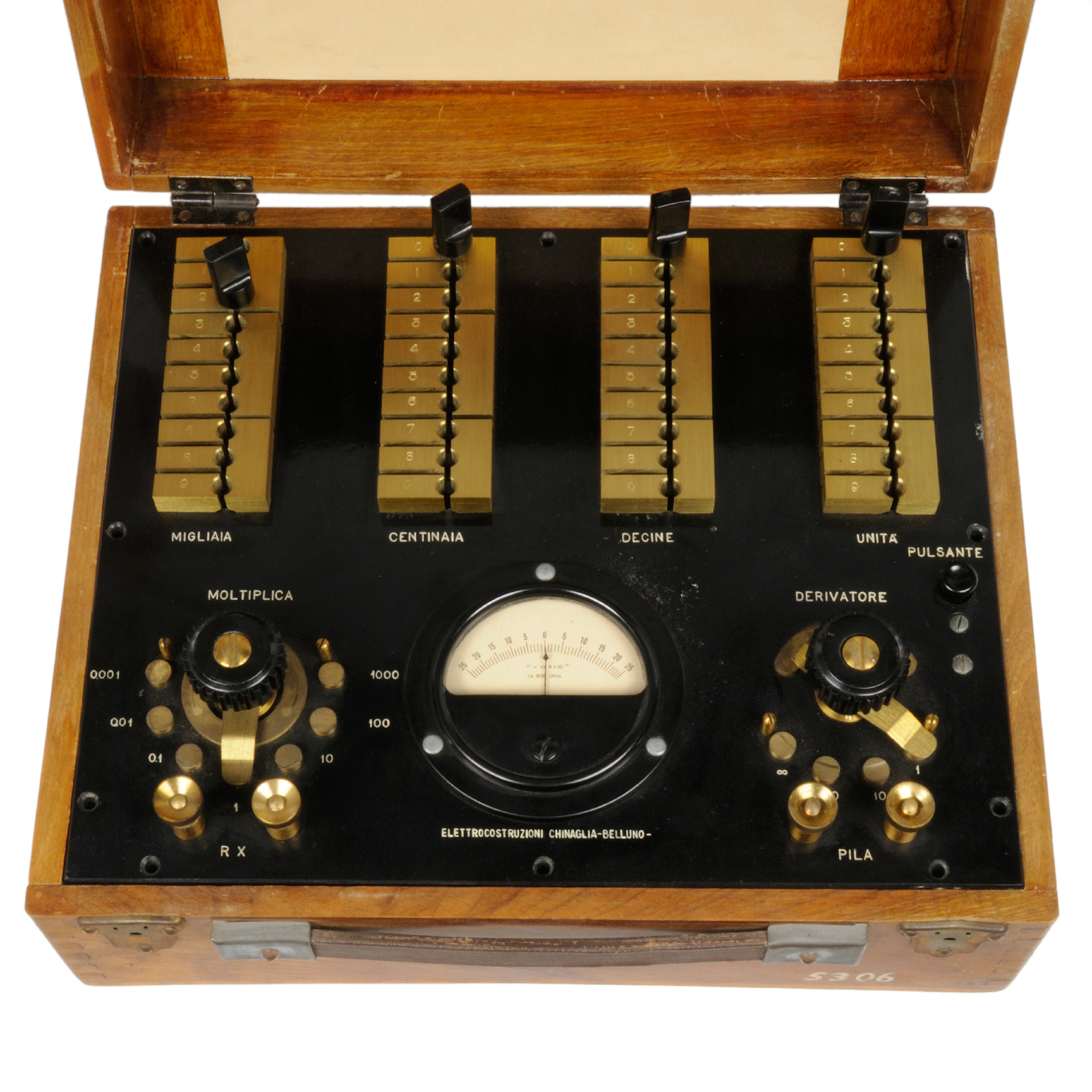 Die hier vorgestellte Wheatstone Messbrücke ist ein in einer Holzbox eingebaute tragbare Variante. Das Gerät besitzt ein eingebautes Galvanometer zur Strommessung. Die Vergleichswiderstände werden über 4 Serien Rheostaten (0-9, 10-90, 900-1000, 1000-9000 Ohm) und einen Multiplikator eingestellt. Die eingebauten Widerstände bestehen aus Manganin (Legierung bestehend aus 84% Kupfer, 12% Mangan und 4% Nickel) und sind für 20 ° C kalibriert.