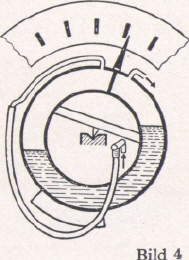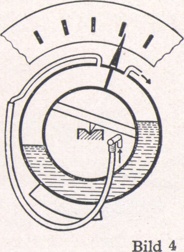 Das Ringwaage-Meßwerk (Bild 4) besteht aus einem drehbar gelagerten Hohlring, der zur Hälfte mit Flüssigkeit gefüllt ist. Der Raum über der Flüssigkeit ist durch eine Trennwand in zwei Kammern geteilt, die mit den Meßleitungen verbunden sind. Durch die Wirkung der Druckdifferenz auf die Trennwand wird ein Drehmoment am Waagering erzeugt. Der Waagering dreht sich, bis er durch das Gegen-Drehmoment des Gewichtes in die Gleichgewichtslage kommt.