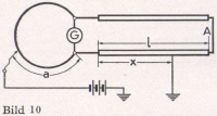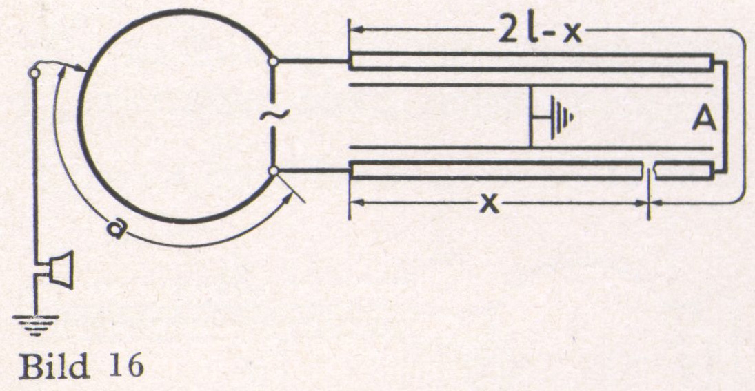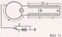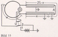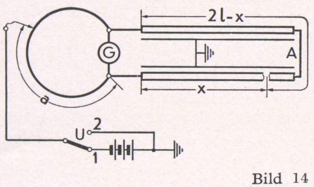 Die gebrochene Ader wird mit einer gesunden Ader bei A verbunden, die Meßbrücke an die beiden offenen Enden angeschlossen (Bild 14). Auf Stellung 1 des Umschalters U werden die beiden Kabelstücke x und 2 l - x geladen, auf Stellung 2 entladen.