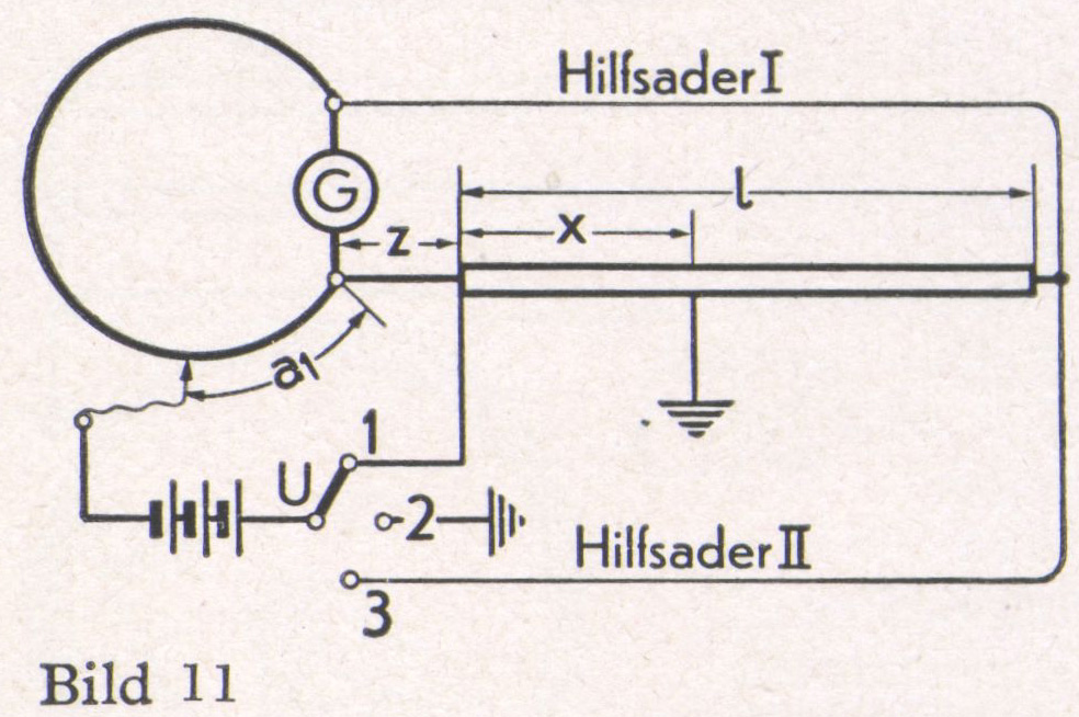 Bei der Messung ist der Umschalter U der Reihe nach auf die Stellungen 1, 2, 3 zu schalten, wobei jedesmal auf dem Schleifdraht die Stelle festzustellen ist, bei der das Galvanometer stromlos wird. Sind die drei Ablesungen am Schleifdraht a1 a2 und a3, und ist 1 die einfache Kabellänge, so wird der Fehlerort errechnet: