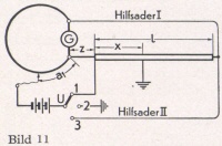 Diese Schaltung (Bild 11) gewährleistet höchste Genauigkeit, da der Querschnitt und die Länge der Hilfsleitungen (Zuleitung z, Hilfsader I und II) ohne Einfluß sind. Es können also als Hilfsadern I und II entweder gesunde Adern des Kabels oder fremde Leitungen beliebigen Querschnitts verwendet werden.