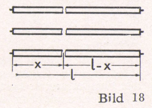 Die gebrochene Ader wird mit einer gesunden Ader bei A verbunden (Bild 17). Gemessen werden die Kapazitäten gegen Erde von x (= Ci) und von 2 1 — x (= C2). Da die Leitungslängen verhältnisgleich den Kapazitäten sind, ergibt sich: