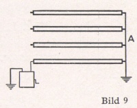 Alle Adern des Kabels werden bei A geerdet (Bild 9). Der Reihe nach werden sie mit einem Isolationsprüfer, z. B. mit einem Kurbelinduktor (siehe Kurbelinduktor) auf Stromdurchgang geprüft. Ist der Widerstand einer Ader ∞ oder sehr hoch, so ist mit Sicherheit Aderbruch vorhanden.