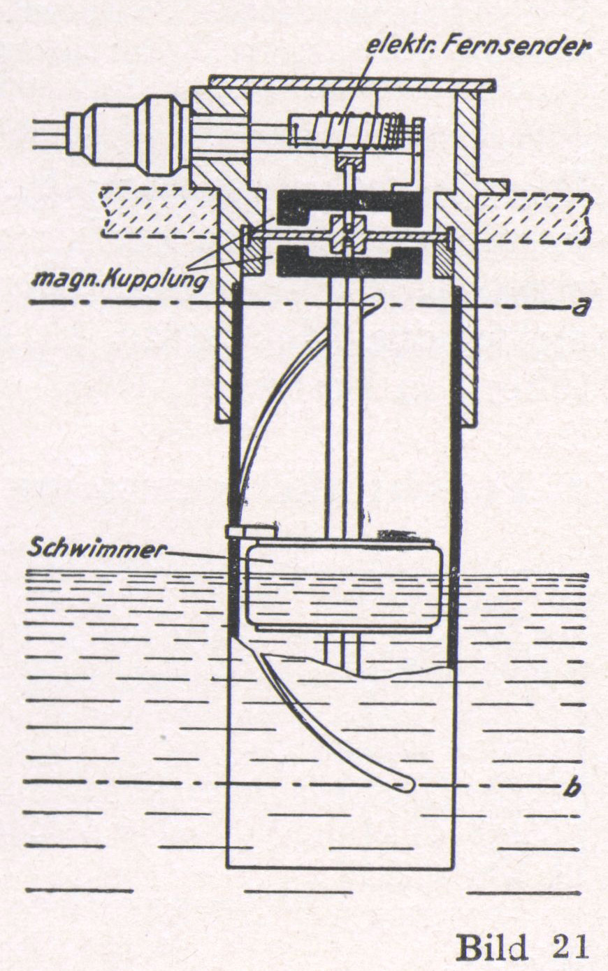 Bei der Fernübertragung des Flüssigkeitsstandes ist eine Schwimmervorrichtung erforderlich, durch die die Änderungen des Standes in eine Drehbewegung umgesetzt werden. Bild 21 zeigt eine solche Vorrichtung zur Vorratsmessung explosibler Flüssigkeiten, z. B. des Brennstoffes in Flugzeugen. Der Schwimmer im Tauchrohr gleitet, je nach der Höhe des Flüssigkeitsspiegels, auf und ab. Bei dieser Bewegung wird er durch eine seitliche Führungsrolle gedreht, die in einen spiralförmig verlaufenden Schlitz des Tauchrohres geführt ist. Die Drehung des Schwimmers überträgt sich auf die Mittelachse, die am oberen Ende den treibenden Teil einer magnetischen Kupplung trägt. Darüber liegt, durch eine unmagnetische Wand vollkommen abgedichtet, der getriebene Teil der magnetischen Kupplung, mit dem der Fernsender starr gekuppelt ist.