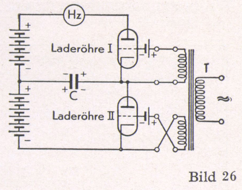 In Bild 26 ist das Grundprinzip dar gestellt, nach dem ein Gerät für Frequenzen bis etwa 100 kHz arbeitet. An die Wechselstromquelle, deren Frequenz gemessen werden soll, wird der Gegentakt-Transformator T angeschlossen. Die Spannungen der beiden Sekundärwicklungen sind an die negativ vorgespannten Gitter zweier Laderöhren I und II gelegt. Da Wicklung 2 in umgekehrter Polung wie I angeschlossen ist, wird z. B. in einem Augenblick an Gitter I durch die obere Halbwelle des Wechselstromes eine positive und an Gitter II eine negative Vorspannung sein;