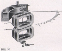 a) Beim eisenlosen Meßwerk, um den Fremdfeld-Einfluß auszuschalten (astatisches Meßwerk, Bild 36). Die Spulen werden so in Reihe geschaltet, daß die Fremdfeldfehler des oberen Meßwerks denen des unteren entgegengesetzt sind.