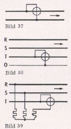 3. Drehstrom mit gleichbelasteten Phasen u. mit zugänglichem Nullpunkt (Bild 38). Es wird nur die Leistung einer Phase (Strom X Sternspannung) gemessen und der abgelesene Wert mit 3 multipliziert.