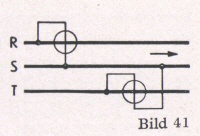 5. Drehstrom mit ungleich belasteten Phasen mit Nulleiter (Bild 40). Die Messung wird auf 3 Wechselstrom-Messungen zurückgeführt, die addiert die Gesamtleistung ergeben. Die drei Meßwerke können in einem einzigen Gerät so angeordnet sein, daß sich ihre Drehmomente mechanisch addieren.
