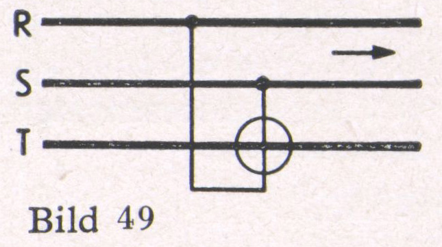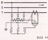 Bei Drehstrom mit gleichbelasteten Phasen kann durch Schaffung einer Kunstphase im Meßgerät ein Wandler eingespart werden. Die Messung ist dann jedoch nur bei einer bestimmten Frequenz richtig (Bild 46).