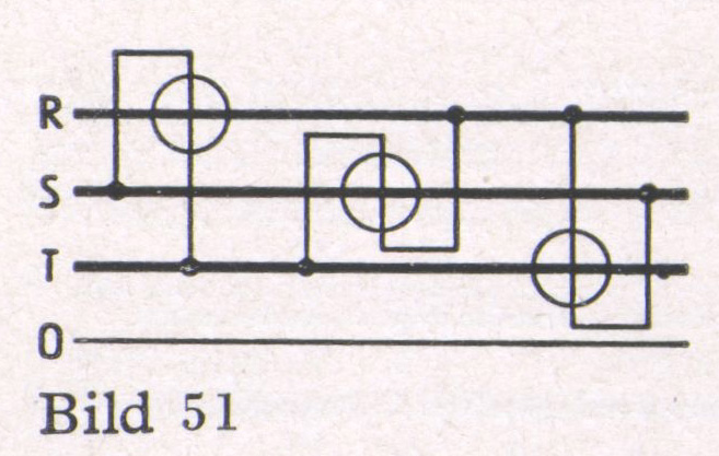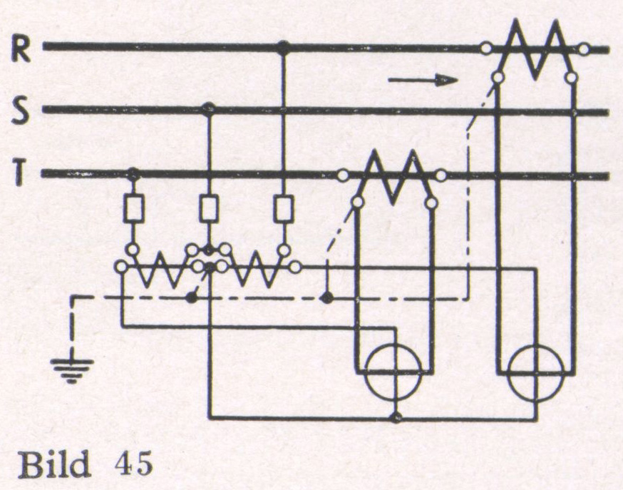 4. Drehstrom mit gleichbelasteten Phasen ohne zugänglichen Nullpunkt (Bild 39). Durch drei in Stern geschaltete Widerstände wird ein künstlicher Spannungs- Nullpunkt gebildet und dann wie unter 3. gemessen.