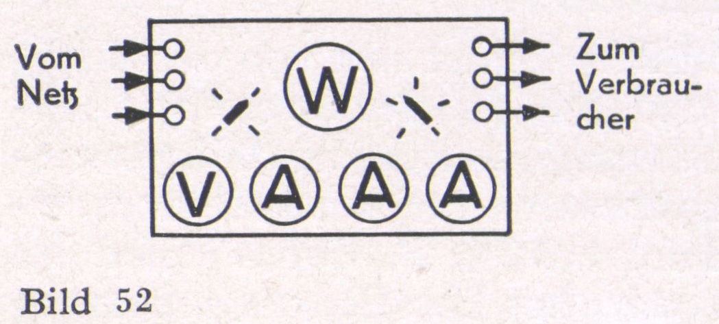 3. Ungleichbelasteter Drehstrom mit Nulleiter (Bild 51). Die Anzeige der drei Leistungsmesser ist zu addieren und die Summe durch √3 zu dividieren, da die Spannungsspulen an der verketteten Spannung (= Sternspannung . √3) liegen. Die Messung ist nur dann richtig, wenn die drei Spannungen gleich sind. Im allgemeinen genügt die erreichbare Genauigkeit für Betriebsmessungen.