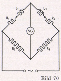 In Bild 70 ist L1 eine bekannte, Lx die unbekannte, zu messende Selbstinduktion, R1 ... R4 sind induktions- und kapazitätsfreie, regelbare Widerstände, VG ist ein Vibrations-Galvanometer. Die Brücke wird von Wechselstrom gespeist.
