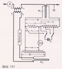Der Primärstrom I1 des zu prüfenden Stromwandlers durchfließt den Strommesser A und ein Widerstandsnormal N1 Der Sekundärkreis ist über eine Belastung und das Widerstandsnormal N2 geschlossen und wird vom Strom I2 durchflossen. Parallel zu N1 und N3 liegen die Spannungsteiler R und W, außerdem parallel zu einem Teilwiderstand von R die Kapazität C. Das Verhältnis W : w wird entsprechend dem Übersetzungsverhältnis des Prüflings eingestellt. Als Nullgerät dient ein Vibrations- Galvanometer VG. Die Kompensation der Spannung erfolgt durch den Regelwiderstand r1, die der Phasenlage durch den regelbaren Kompensator C. Das Vibrations- Galvanometer zeigt erst Null, wenn sowohl Spannung als auch Phase kompensiert sind. Der Stromfehler kann unmittelbar am Regelwiderstand rt abgelesen werden, während die Stellung des regelbaren Kompensators C ein Maß für den Fehlwinkel ist.