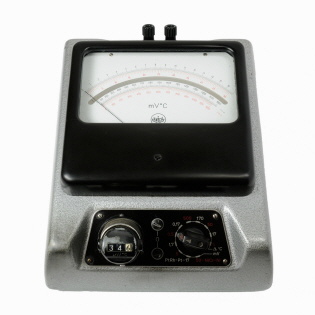 Das Messwerk ist in einem schweren Gehäuse aus Aluminiumguß eingebaut. Die Anzeige erfolgt über ein großes Drehspul-Messwerk (Hersteller Gossen). Neben dem Messbereichsumschalter befindet sich ein Präzisionsregler zur Eichung des Messfühlers, mit einem Einstellbereich von 300 ... 700 µV / °C. Auf der Rückseite finden sich die Anschlussklemmen für den Messfühler und die Stromversorgung. |
