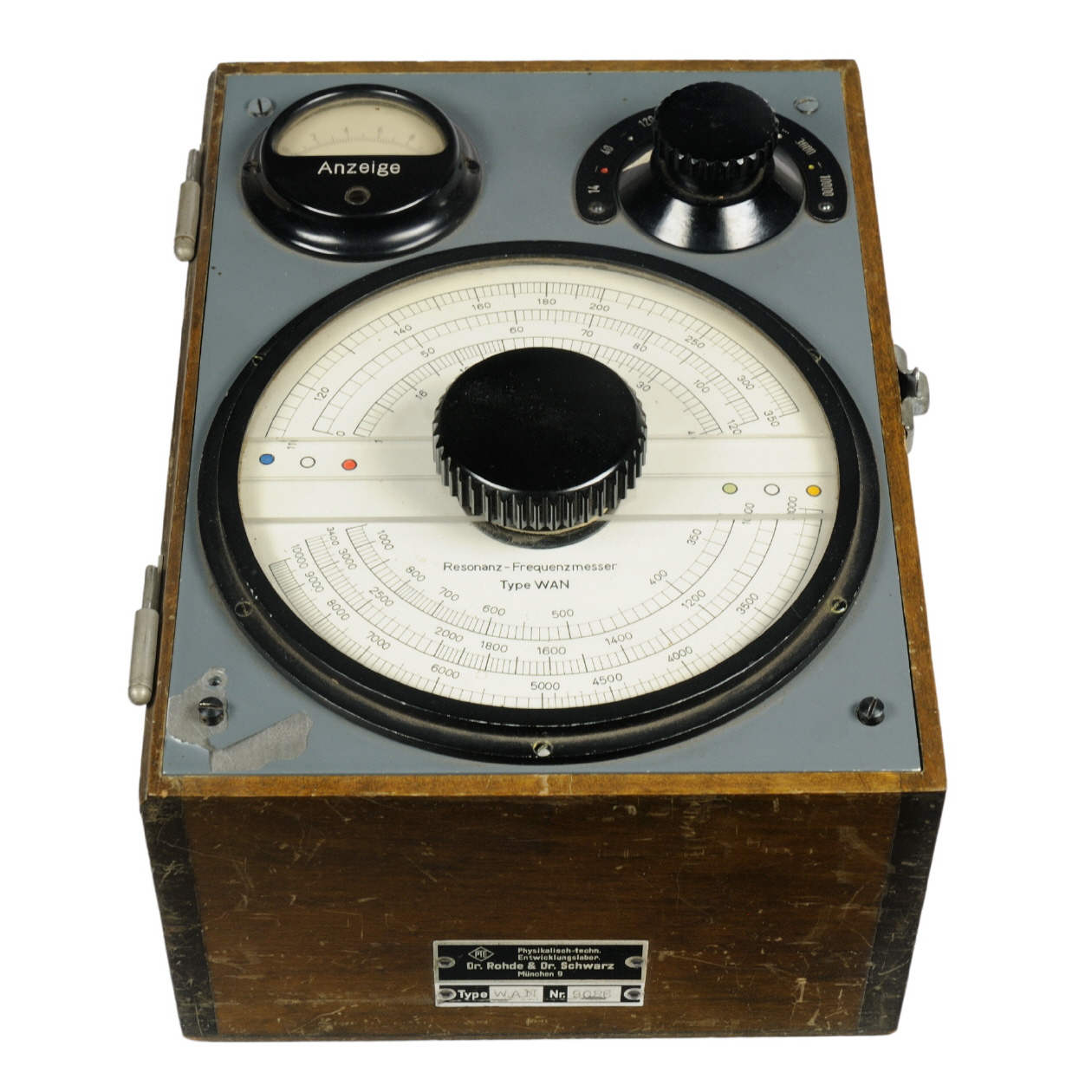 Der Hochfrequenztechniker wünscht sich in vielen Fällen einen handlichen, möglichst ohne Stromquellen zu betreibenden Frequenzmesser, mit dem er Abgleich- und Trimmarbeiten während der elektrischen Fertigung seiner Geräte vornehmen kann. Eine besonders hohe Genauigkeit ist dabei meistens nicht nötig, dagegen ist direkte Eichung unumgänglich. Diese Bedingungen erfüllt der abgebildete Resonanzfrequenzmesser; das Gerät arbeitet nach diesem Prinzip und entnimmt die zur Anzeige nötige Energie dem zu messenden Sender; eigene Stromquellen sind demnach nicht nötig. Der eingebaute verlustarme Kreis hat einen umschaltbaren Spulensatz, als veränderliche Kapazität findet ein Drehkondensator Anwendung, dessen Abstimmskala direkt geeicht ist. Zur Anzeige dient ein Gleichrichter in Verbindung mit einem empfindlichen Instrument, dessen Endausschlag 1 · 10-4 A entspricht. In der Normalausführung arbeitet ein Sirutor als Gleichrichter; bei den Sonderausführungen B. N. 4301 (150 kHz ... 60 MHz) und B. N. 4302 (2,3 ... 120 MHz), deren Bereiche 10 MHz überschreiten, ist im Interesse bester Empfindlichkeit bei den höchsten Frequenzen der Sirutor durch einen Detektor ersetzt. Durch den Einbau in ein Holzgehäuse mit abnehmbarem Deckel ist das Gerät sehr handlich und stabil und durch die große Vollsichtskala rasches Arbeiten möglich.