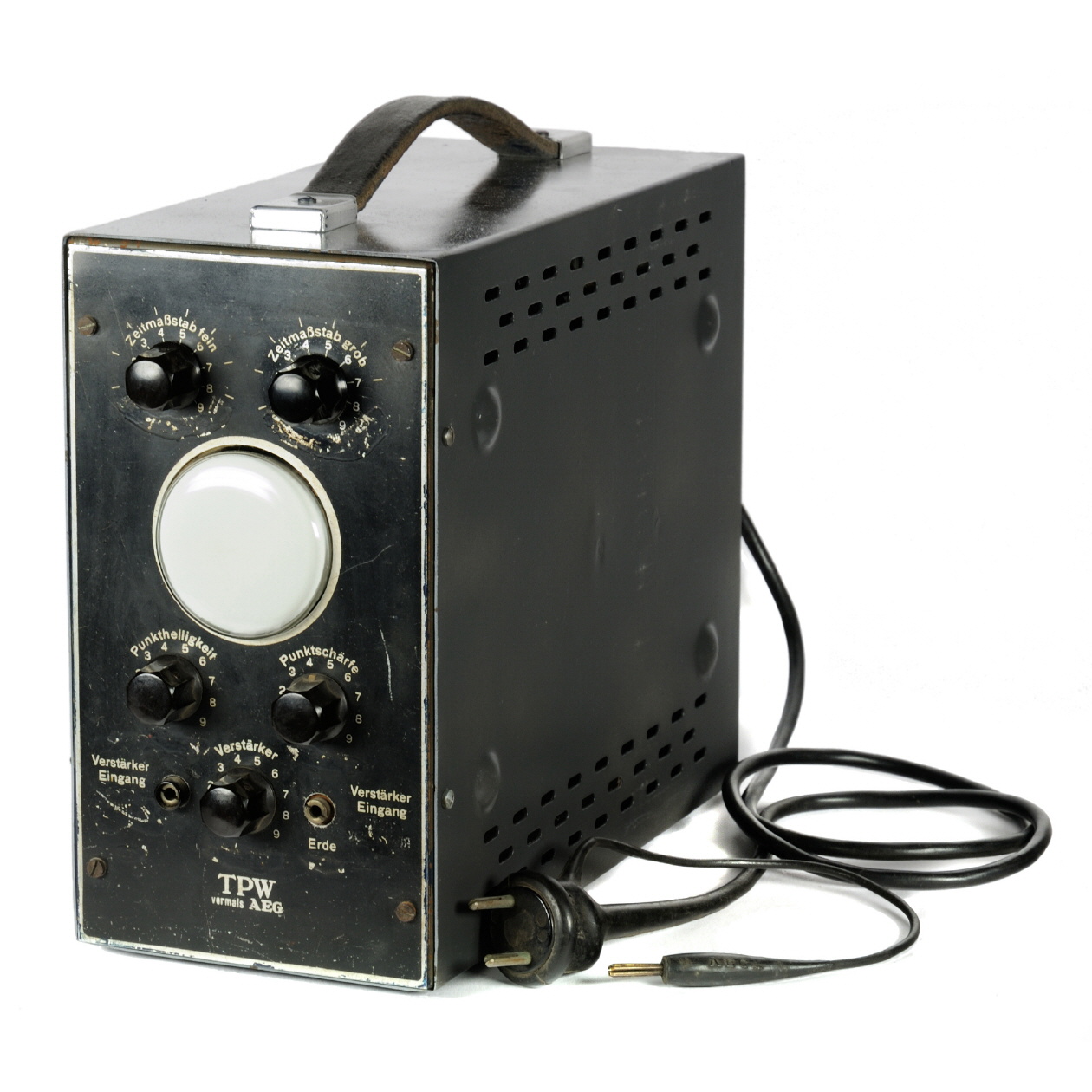 Das Gerät wurde kurz nach Kriegsende gefertigt (Notzeitgerät) und ist entsprechend einfach aufgebaut. Das Gerät bietet vorne Einstellungen für den Verstärkungsfaktor, die Punktschärfe und den Zeitmaßstab (jeweils ohne genaue Angaben und Eichung). Auf der Rückseite sind Eingänge für Kippspannung, Zeit-Meßplatten und Erde. |