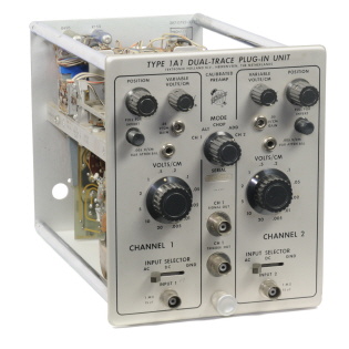 Der Zweispur-Verstärker-Einschub Typ 1A1 enthält 2 identische geeichte Vorverstärker-Kanäle von hoher Verstärkung und kleiner Anstiegszeit. Jeder der beiden Kanäle lässt sich unabhängig vom andern zur Einspur-Darstellung verwenden oder elektronisch umschalten, um eine Zweispur-Darstellung zu erzeugen. Zusätzlich lassen sich beide Ausgänge der Kanäle zusammenschalten, wodurch je nach Stellung der Polaritätsschalter die Summe oder Differenz der angelegten Signale erhalten wird. Jeder Kanal ist mit Bedienungselementen für die Wahl der Eingangskopplung, Abschwächung, Verstärkung, Polarität und Strahllage ausgerüstet, die es gestatten, die Darstellung auf dem Schirm so vorzunehmen, dass sich ein Optimum für die Betrachtung und die Details ergibt. Bei Zweispurbetrieb besteht die Möglichkeit der Wahl zweier Betriebsarten, CHOPPED (freilaufende Teilbildumschaltung) und ALTERNATE (ablenksynchrone Kanalumschaltung]. Bei der freilaufenden Teilbildumschaltung CHOPPED schaltet ein eingebauter, freilaufender Multivibrator die Kanäle mit einer Frequenz von etwa 1 MHz um. Bei ablenksynchroner Kanalumschaltung ALTERNATE werden die Kanäle durch den Zeitbasis-Generator des Oszillografen am Ende jeder Zeitablenkung während des Strahlrücklaufs intern umgeschaltet.