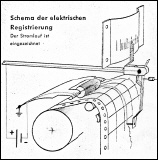 Das Diagramm des Registriergerätes bildet eine zuverlässige Unterlage für die Beurteilung eines Betriebes, da es fortlaufend alle Schwankungen der Messgröße wiedergibt. Deshalb werden heute mehr und mehr Registriergeräte verwendet, vor allem dort, wo es nicht möglich ist, die Anzeigegeräte regelmäßig abzulesen. Die hauptsächlichsten Forderungen an Registriergeräte sind, neben der Genauigkeit, lange Laufzeiten ohne Wartung und sichere Aufzeichnung, auch bei großer Schreibgeschwindigkeit und stark schwankender Messgröße. Die elektrische Registrierung (Metallpapier-Schreibverfahren) ermöglicht Schreibgeschwindigkeiten bis zu mehreren m/s, bei großer Schreibsicherheit und geringster Wartung. Die Aufzeichnung erfolgt durch eine dünne Stiftelektrode, die aus dem Metallbelag des Registrierstreifens eine feine Spur ausbrennt. Statt einer Tintenfeder verwendet man dazu eine Schreibelektrode (Stiftelektrode mit Halter), die ähnlich wie die Tintenfeder in den Schreibarm eingesetzt wird. Die Schreibelektrode liegt leicht auf dem Registrierstreifen auf, der Auflagedruck kann eingestellt werden. Der Registrierstreifen besteht aus Metallpapier (MP-Streifen), d. h. er ist mit einer sehr feinen Metallschicht, die einen niedrigen Schmelzpunkt hat, im Vakuum bedampft. Bei der Aufzeichnung fließt von einer Schreibspannungsquelle (18 bis 24 V-) ein Strom über den Messwerkarm und die Elektrode zum Metallpapier. Von dem Papier wird der Strom durch eine großflächige Kohlerolle abgenommen, die ihrerseits wieder mit der Schreibspannungsquelle verbunden ist. Der Lichtbogen zwischen Elektrode und Metallbelag verbrennt letzteren. Dadurch entsteht eine gut sichtbare Markierung und, sobald der Streifen fortbewegt wird, eine exakte Schreibspur. Als Schreibspannungsquelle werden Netzanschlußgeräte, Akkumulatoren oder Trockenelemente verwendet. Die Stromaufnahme ist verschieden je nach der Anzahl der Schreibelektroden und der Schreibgeschwindigkeit. Der Schreibstrom einer Elektrode beträgt bei normalem Vorschub (20 mm/h) etwa 2 ;µA; die mittlere Stromaufnahme ist so gering, dass auch schwache Stromquellen (z. B. Anodenbatterien für Schwerhörigengeräte) genügen, um mit mehreren Elektroden längere Zeit (über sechs Monate) zuverlässig zu registrieren. Ein Störungsschreiber mit acht' Elektroden nimmt während des Schnellablaufs (Vorschub 60 mm/s) einen Schreibstrom von2 bis 10 mA auf. Die Lebensdauer der Schreibelektroden ist groß - sie nützen sich bei 30000 m Schreibspurlänge nur etwa 1 mm ab. Die elektrische Registrierung wird in immer größerem Umfang angewendet, da sie viele Vorteile bietet: Die regelmäßige Wartung der Tintenfeder entfällt, die vor allem bei Mehrfachschreibern (z.B. Zeitschreibern) oft recht zeitraubend ist. Der Auflagedruck der Schreibelektrode bleibt stets gleich, da er sich nicht mit abnehmender Tintenfüllung ändern kann. Störungen bei hoher Temperatur (durch ausgetrocknete Tinte) entfallen. Auch bei starken Schwankungen des Messwertes oder bei wechselndem Vorschub (z. B. beim Störungsschreiber) reißt die Aufzeichnung nicht ab.