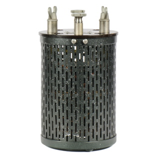 Der Widerstand ist in einem zylindrischen Gehäuse von 104 mm Durchmesser und 150 mm Höhe eingebaut. Der Widerstand ist für den Betrieb in einem Ölbad (Petroleumbad) zur Kühlung ausgelegt. Die obere Deckplatte ist aus Konststoff gefertigt. Im Inneren ist der Widerstandsdraht (Manganin) ist auf einer Messingrohr von 70 mm Durchmesser und 90 mm Länge gewickelt. Der Widerstand selbst besteht aus drei parallel geschalteter Widerstände, zwei aus dickem Draht, einen aus deutlich dünnerem Draht gewickelt. |