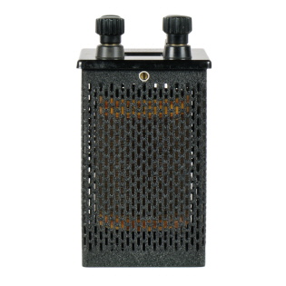 Im Gegensatz zu den älteren Modellen von Hartmann & Braun ist dieser Widerstand in einem viereckigen Gehäuse eingebaut. Der Widerstand ist für den Betrieb in einem Ölbad (Petroleumbad) zur Kühlung ausgelegt. Die obere Deckplatte ist aus Pressstoff gefertigt. Im Inneren ist der Widerstandsdraht (Manganin) ist auf einem Keramikrohr von 72 mm Durchmesser und 100 mm Länge gewickelt. Das Keramikrohr ist über drei Messing-Federn festgeklemmt. Im Vergleich zu den früheren Widerständen ist der Aufbau deutlich weniger stabil. |
