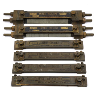 Die Nebenwiderstände sind vollständig aus Messing gefertigt. Der Widerstand selbst besteht aus nicht näher bekanntem Material. Interessant an den Shunts sind deren Widerstände, die auf den Geräten angegeben sind. Auf Basis dieser Widerstandswerte hat jeder Shunt einen anderen Spannungsabfall, der bei der Messung zu berücksichtigen ist. Andere Shunts (z.B. von Siemens&Halske) sind dagegen auf einen konstanten Spannungsabfall geeicht, was eine deutlich einfachere Ablesung der Ergebnisse ermöglicht. |