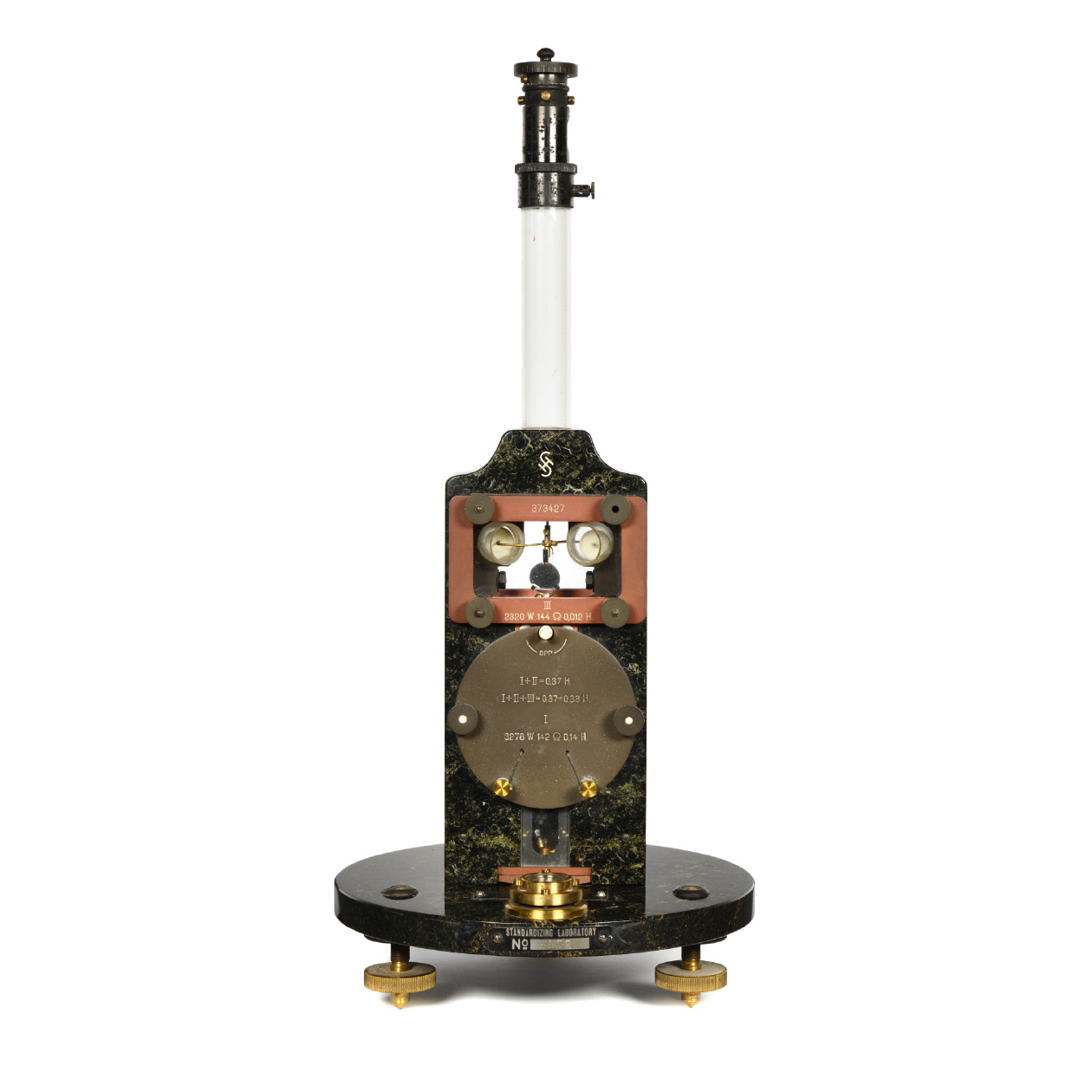 In den Stein eingraviert: S&H Monogramm Seriennummer auf vorderem Fensterrahmen: 373427 Auf hinterem Fensterrahmen: "Germany" Auf Sockel oben geschraubtes Schild "James G. Biddle Philadelphia, U.S.A." Auf Sockel vorne aufgeschraubtes Schild: "Standardizing Laboratory" mit Inventarnummer |