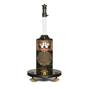 Trotz des kompendiösen Aufbaues, durch den sich das Instrument auszeichnet, sind alle Einzelteile leicht zugänglich und sichtbar. Die feststehenden Spulen besitzen einen kugelförmigen Hohlraum, in welchem die kugelförmig gewickelte, bewegliche Spule konzentrisch aufgehängt ist. Eine einfache Arretierung sichert das schwingende System des Instrumentes auf dem Transport. Die bewährte Form unserer kreisförmig gebogenen Röhrendämpfer hat sich auch bei diesem Instrument als besonders zweckmäßig erwiesen, umso mehr, als die hier gewählte Glasröhrenform die Dämpferscheibe sichtbar lässt. Das Aufhängeband kann bei Bruch ersetzt werden. Für den Hauptkörper des Instrumentes ist ausschließlich Stein gewählt, so dass die exakte Aufstellung in keiner Weise durch Temperatur, Feuchtigkeit usw. beeinflusst werden kann. Für die genaue Aufstellung des Instrumentes mittels der Stellschrauben ist am Sockel eine Dosenlibelle vorgesehen. |