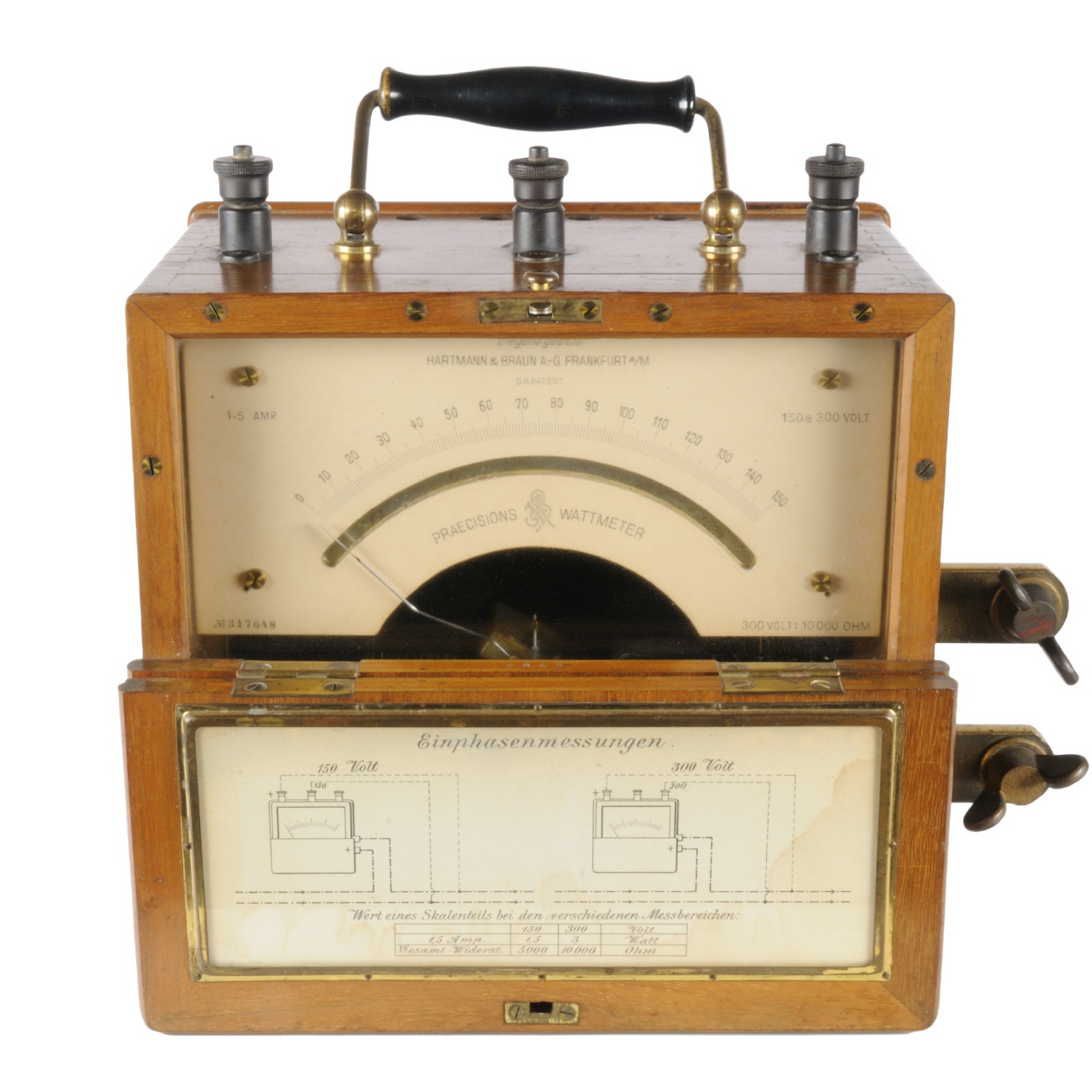 Das Messwerk ist in einem polierten Holzgehäuse eingebaut, auf der Vorderseite ist - wie bei dieser Bauart üblich - ein Klappdeckel zum Schutz der Glasplatte vor der Anzeige angebracht. Auf der Innenseite deiser Klappe findet sich die Anschaltanweisung für die Einphasenmessung sowie eine Anleitung zum Ablesen des Messwerks. Das Gerät besitzt einen Tragegriff (Holz mit Messing-Bügel). Auf der Oberseite finden sich die Anschlussklemmen für die Spannungsmessung, auf der rechten Seite sehr massive Anschlussklemmen für die Strommessung. Die Rückseite besteht aus einer perforierten Blechplatte zur Belüftung des Geräts. |