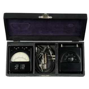 Kleines Mehrfachmeßgerät mit getrenntem Vorschaltgerät zur Widerstandsmessung, Anschlußkabeln und einiger Klemmen in einer Holzbox, innen mit violettem Samt ausgeschlagen. |