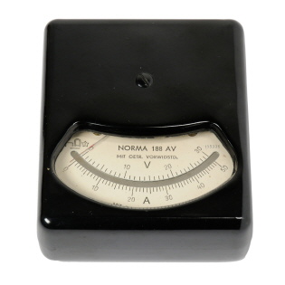 | Das Drehspul-Messgerät Norma 188 AV ist nur für Gleichstrom- und Gleichspannungs-Messungen bestimmt. Normaler Gebrauch im Flugzeug gemäß Schaltbild im Deckel der Ledertasche. An unzugänglichen Stellen kann bei Strommessungen das nebenstehende Schaltbild verwendet werden.Vor jeder Messung ist der Zeiger auf Null zu stellen. Beim Messen kann das Gerät mittels Tragriemen auch umgehängt werden.