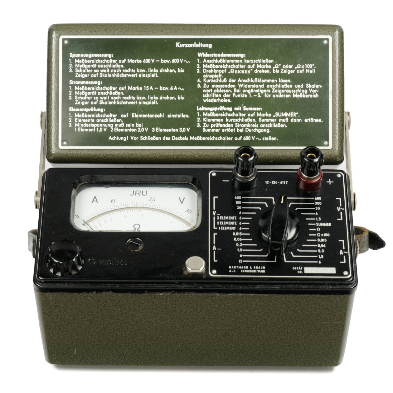 Stahlblech-Gehäuse (Schmutz & Wasserdicht), grüner Hammerschlag-Lack, Preßstoff, Blech, Messing, Glas |
