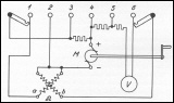 Bei Isolationsmessungen schließt man den unbekannten Widerstand an die Klemmen 1 und 3 an, und zwar so, dass die Klemme 3 an Erde kommt, und schaltet die Lasche bei Klemme 6 ein. Der vom Induktor M gelieferte Strom fließt dann über den eingezeichneten Widerstand nach Klemme 3, durch den unbekannten Widerstand nach Klemme 1 und geht dann über die Spule a des Kreuzspulmesswerks zum Minuspol des Induktors zurück. Ein Zweigstrom geht über die rechts gezeichneten Vorwiderstände, über den Dreheisen-Spannungsmesser V und die Spule b des Kreuzspulmesswerks nach dem Minuspol zurück. Der Spannungsmesser V zeigt also die vom Induktor erzeugte Spannung an. Bei Widerstandsmessungen schließt man den unbekannten Widerstand an die Klemmen 2 und 3 an und schaltet die Laschen bei 1 und 6 ein. Durch die Lasche bei 1 wird der Stromkreis des Induktors geschlossen, so dass der Strom vom +-Pol des Induktors nach der Lasche zur Klemme 1 und von hier über die Spule a zum Minuspol zurückfließt. Der zwischen den Klemmen 2 und 3 liegende unbekannte Widerstand liegt im Nebenschluss der Spule a. Der Spannungsmesser V ist in gleicher Weise wie bei der Isolationsmessung durch die Lasche 6 angeschlossen. Da der unbekannte Widerstand bei dieser Messung im Nebenschluss zum Messinstrument liegt, läuft die Skala für Widerstandsmessungen im entgegengesetzten Sinne wie für die Isolationsmessung. Für Spannungsmessungen lässt man beide Laschen offen und schließt je nach der Größe der zu messenden Spannung zwischen den Klemmen 4 und 6 bzw. 5 und 6 an. Da der Spannungsmesser V ein Dreheisenmesswerk hat, kann man sowohl Gleichstrom- wie auch Wechselstrom messen.