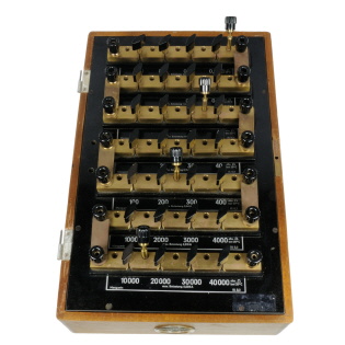 Stöpsel Rheostat, bestehend aus Manganin Widerständen, von 0,01 bis 111.111,1 Ohm einstellbar.