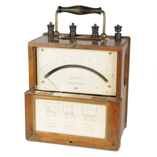 Nicht restaurierter Zustand, ob es sich um den Originalzustand handelt, ist fraglich. Die unteren Gehäusefüße fehlen, bei der linken Anschlußklemme fehlt die Beschriftung. Technisch funktioniert das Gerät, manchmal hängt der Zeiger, die Messergebnisse sind zudem um ca. 10 Volt ungenau. |