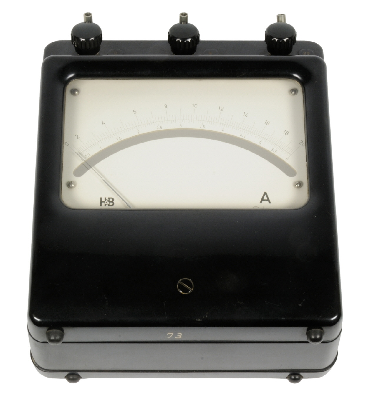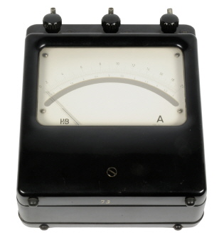 | Beschreibung | Das Gerät besitzt ein Kunststoff-Gehäuse aus schwarzem Pressstoff und ist für den waagerechten Betrieb ausgelegt. Die Skala ist als Spiegelskala ausgeführt mit einer nicht-linearen Unterteilung von 0 ... 20 bzw. 0 ... 6. Über drei Schraubklemmen (mit zusätzlicher Lasche und 4 mm Buchse), wird das Meßobjekt angeschlossen (Klemme 0 & 6 - 6 A; 0 & 20 - 20 A Messbereich).