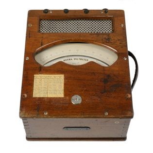 Das Voltmeter ist in einem Holzgehäuse eingebaut. Auf der Front- und Rückseite finden sich Lüftungsbleche. Die Skala ist als Spiegelskala mit nich-linearer Einteilung ausgeführt. Auf der rechten Seite befindet sich ein Tragegriff aus Leder. |