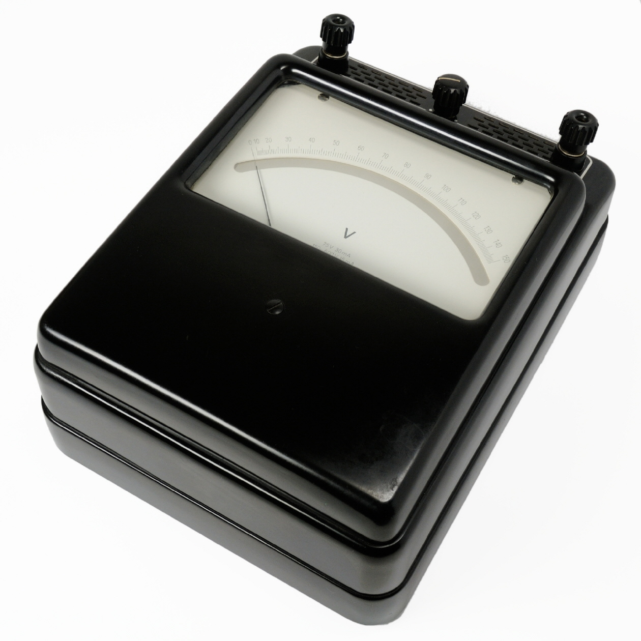Das Gerät besitzt ein Kunststoff-Gehäuse aus schwarzem Pressstoff und ist für den waagerechten Betrieb ausgelegt. Die Skala ist als Spiegelskala ausgeführt mit einer nicht-linearen Unterteilung von 0 ... 150. Über zwei Schraubklemmen (mit 4 mm Buchse), wird das Meßobjekt angeschlossen. Die Messbereiche werden über einen Umschalter ausgewählt. |
