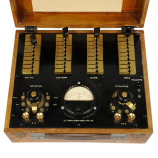 Die hier vorgestellte Wheatstone Messbrücke ist ein in einer Holzbox eingebaute tragbare Variante. Das Gerät besitzt ein eingebautes Galvanometer zur Strommessung. Die Vergleichswiderstände werden über 4 Serien Rheostaten (0-9, 10-90, 900-1000, 1000-9000 Ohm) und einen Multiplikator eingestellt. Die eingebauten Widerstände bestehen aus Manganin (Legierung bestehend aus 84% Kupfer, 12% Mangan und 4% Nickel) und sind für 20 ° C kalibriert. Das Gerät besitzt Anschlüsse für eine externe Stromquelle und für den unbekannten, zu messenden Widerstand.