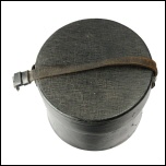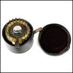 Das Gehäuse, ein Zylinder aus Aluminiumblech mit ca. 160 mm Ø sitzt auf einem Holzsockel, der ursprünglich eine Trockenbatterie mit ca. 110 x 73 mm aufnehmen konnte. Die Batterie wird an den beiden Messing-Klötzchen auf dem Boden angeschlossen, durch zwei lange, auf der Innenseite des Deckels befestigten Messing Stangen, erfolgt der Anschluss an das Messwerk. Den Deckel des Zylinders bildet eine ca. 10 mm dircke Ebonit-Platte, auf deren Oberseite (außen) die Stöpsel für die Widerstände, die Anschlußklemmen und das Messwerk selbst angebracht sind. Auf der Unterseite (innen) befinden sich die Widerstände, die auf Holzkörpern bifilar gewickelt sind. Mittig sitzt bei diesem Exponat das Messwerk, das als kleines Drehspul-Galvanometer mit ca. 10 Ω und einer Empfindlcihkeit von ca. 50 µA / 1° Ausschlag, ausgeführt ist. Rund um das Messwerk sind die Messing-Blöcke für die Spöpselwiderstände angeordnet, beginnend bei der linken Anschlussklemme im Uhrzeigersinn mit 100, 10, 1, 1, 10, 100, 1, 2, 2, 5, 10, 10, 20, 50, 100, 100, 200 und 500 beschriftet. |