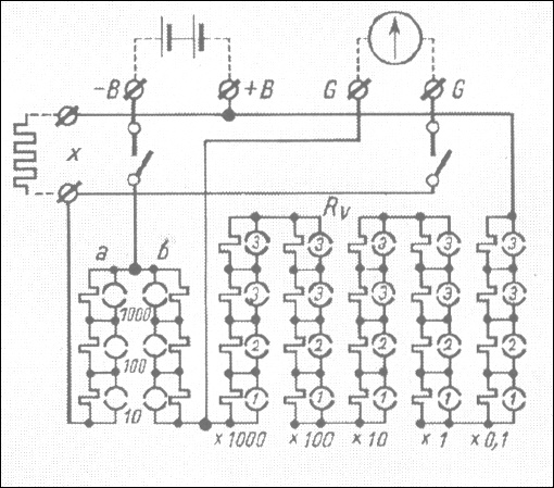 Die induktionsfrei gewickelten Widerstände sind sämtlich in Reihe geschaltet. Die Verhältniswiderstände a und b enthalten je 3 Werte 10, 100, 1000 Ω ; der Vergleichswiderstand Rv umfasst 9999,9 Ω in fünf Reihen zu je 4 Widerständen mit der Stufung 1, 2, 3, 3. Im Batterie- und Galvanometerkreis sind feststellbare Tasten eingebaut. |
